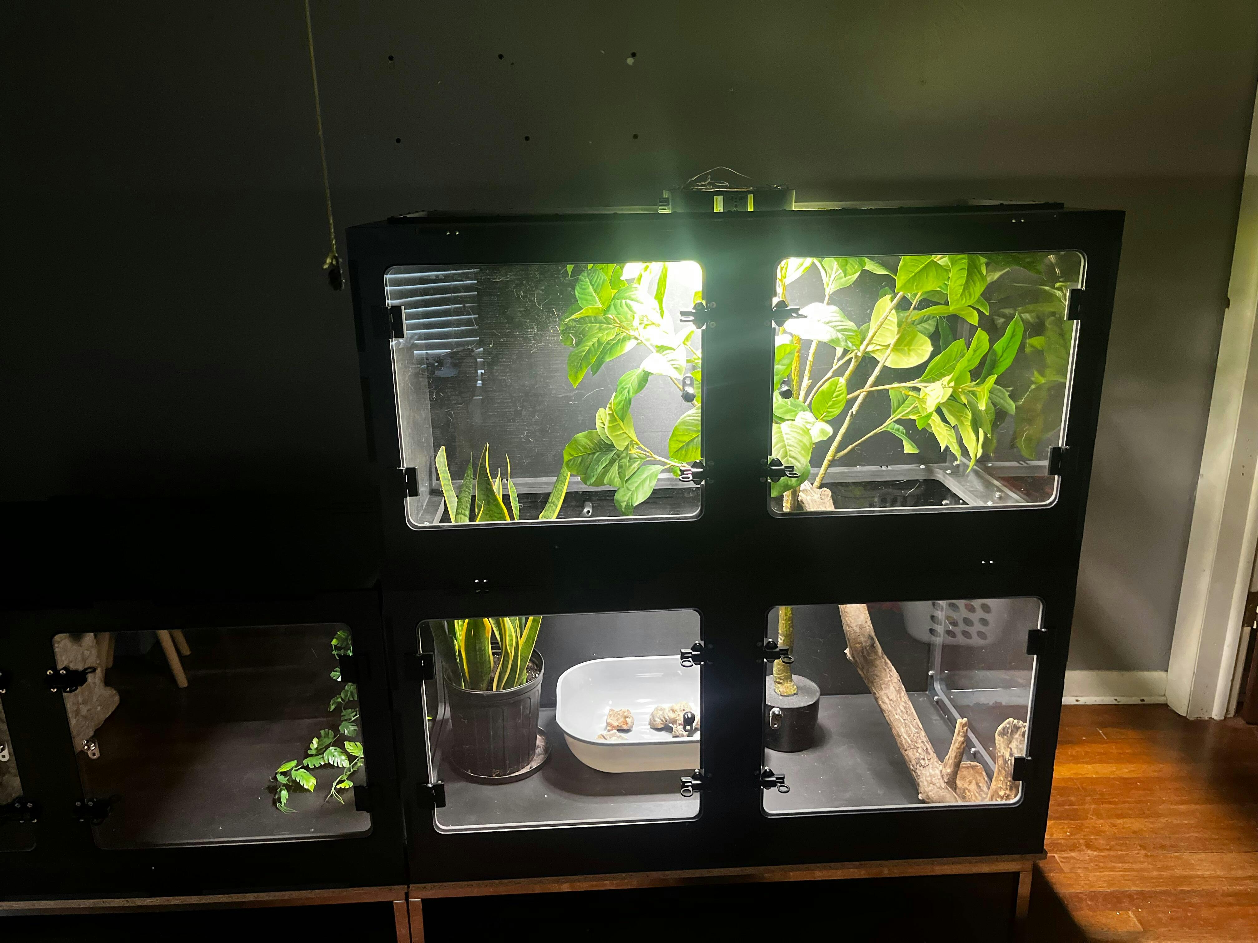 Not one cheap part on this enclosure. Metal hinges, metal latches and great locks. Thick, thick plexiglass, clear as crystal. All tolerance were tight. Just take your time, and use a hand screwdriver. It’s a lot of work, but it’ll help with putting in the screws straight. I got a 8x2. One section is 4 foot tall. It’s for my false water cobra. This is gonna be a paradise for him. I am completely impressed. I’m trying to get another false water cobra so keep making good products and I’ll be back soon. I’m still kind of in the middle of building it, but I’m taking my time on purpose. I could’ve had this thing up in an hour, but I’ve ordered special lights and tons of furniture because this enclosure is gigantic.