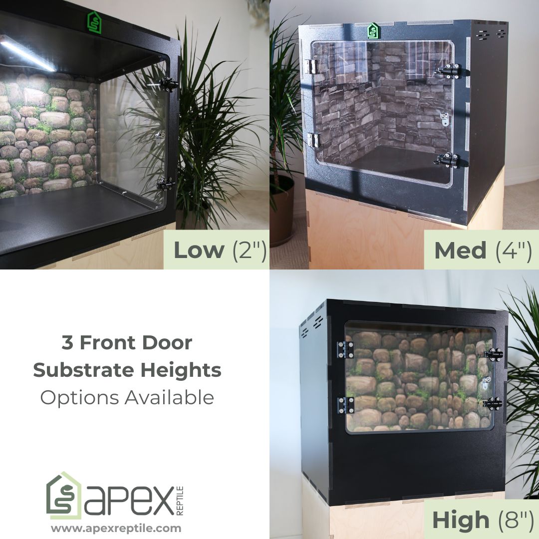 To keep costs optimal, enclosures are currently available in black PVC only, but you can customize the front face color or cover the seams with an Apex Reptile Front Face Cover.